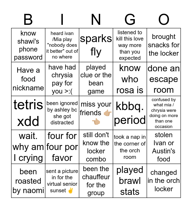 This bingo card has a free space and 24 words: four for four por favor, sent a picture in for the virtual senior sunset ✌️, played clue or the bean game, been roasted by naomi, brought snacks for the locker, know shawi's phone password, Have a food nickname, heard ivan /Mia play "nobody does it better" out of no where, kbbq. period, still don't know the locker combo, know who rosa is, tetris xdd, took a nap in the corner of the orch room, stolen Ivan or Austin's food, have had chrysia pay for you >:(, played brawl stats, confused by what mia / chrysia were doing on more than one occasion, sparks fly, done an escape room, been ignored by ashley bc she got distracted, changed in the orch locker, wait. why am I crying, listened to kill this love way more than you expected and been the chauffeur for the group.
