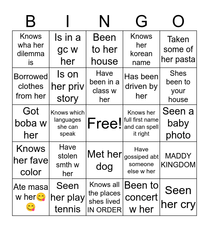 This bingo card has a free space and 24 words: Have stolen smth w her, Seen her play tennis, Have been in a class w her, Ate masa w her๐๐, Taken some of her pasta, Knows wha her dilemma is, Borrowed clothes from her, Is in a gc w her, Knows her full first name and can spell it right, Met her dog, Has been driven by her, Got boba w her, Have gossiped abt someone else w her, MADDY KINGDOM, Is on her priv story, Been to concert w her, Seen a baby photo, Been to her house, Shes been to your house, Knows which languages she can speak, Seen her cry, Knows her fave color, Knows her korean name and Knows all the places shes lived IN ORDER.