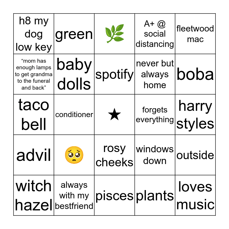 This bingo card has a free space and 24 words: 🥺, always with my bestfriend, spotify, witch hazel, fleetwood mac, h8 my dog low key, “mom has enough lamps to get grandma to the funeral and back”, green, forgets everything, rosy cheeks, never but always home, taco bell, windows down, outside, baby dolls, plants, harry styles, 🌿, boba, conditioner, loves music, advil, A+ @ social distancing and pisces.
