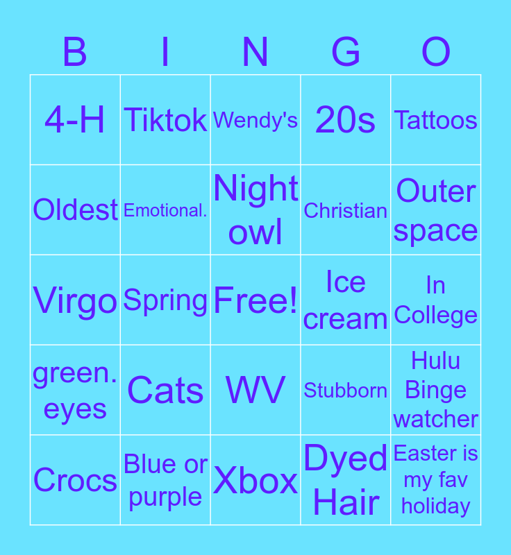 This bingo card has a free space and 24 words: Crocs, Cats, Night owl, Dyed Hair, Tattoos, 4-H, Tiktok, Wendy's, Ice cream, In College, Virgo, Emotional., Stubborn, Hulu Binge watcher, Oldest, Blue or purple, Xbox, 20s, Outer space, green. eyes, Spring, WV, Christian and Easter is my fav holiday.