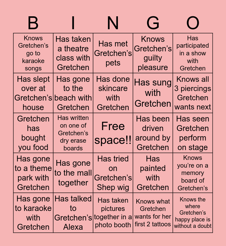 This bingo card has a free space and 24 words: Has gone to the mall together, Has talked to Gretchen’s Alexa, Has done skincare with Gretchen, Has gone to karaoke with Gretchen, Has participated in a show with Gretchen, Knows Gretchen’s go to karaoke songs, Has slept over at Gretchen’s house, Has taken a theatre class with Gretchen, Has been driven around by Gretchen, Has tried on Gretchen’s Shep wig, Has sung with Gretchen, Gretchen has bought you food, Has painted with Gretchen, Knows you’re on a memory board of Gretchen’s, Has gone to the beach with Gretchen, Knows what Gretchen wants for her first 2 tattoos, Has seen Gretchen perform on stage, Has met Gretchen’s pets, Knows all 3 piercings Gretchen wants next, Has written on one of Gretchen’s dry erase boards, Knows the where Gretchen’s happy place is without a doubt, Has gone to a theme park with Gretchen, Knows Gretchen’s guilty pleasure and Has taken pictures together in a photo booth.