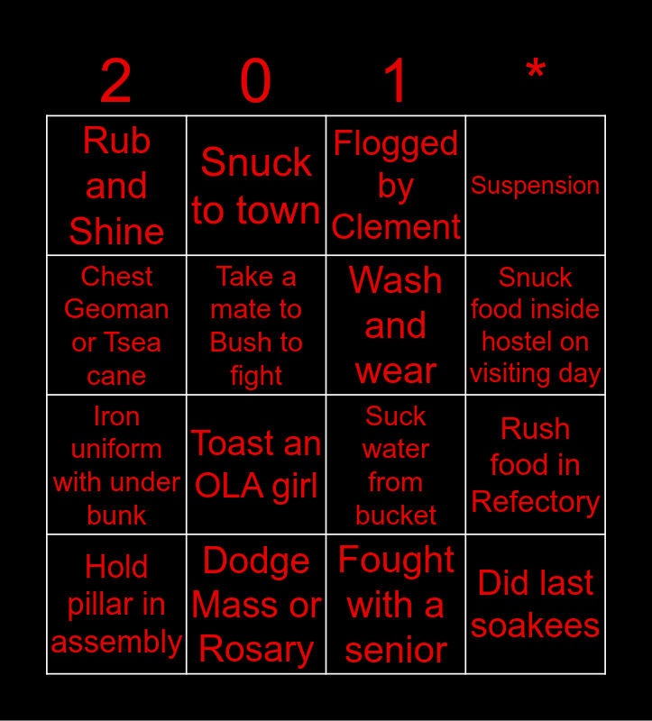 This bingo card has 16 words: Dodge Mass or Rosary, Rush food in Refectory, Flogged by Clement, Rub and Shine, Iron uniform with under bunk, Snuck to town, Suck water from bucket, Fought with a senior, Chest Geoman or Tsea cane, Take a mate to Bush to fight, Hold pillar in assembly, Suspension, Toast an OLA girl, Snuck food inside hostel on visiting day, Wash and wear and Did last soakees.