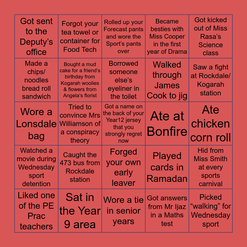 This bingo card has a free space and 24 words: Caught the 473 bus from Rockdale station, Sat in the Year 9 area, Borrowed someone else’s eyeliner in the toilet, Liked one of the PE Prac teachers, Got kicked out of Miss Rasa’s Science class, Got sent to the Deputy’s office, Made a chips/ noodles bread roll sandwich, Forgot your tea towel or container for Food Tech, Ate at Bonfire, Forged your own early leaver, Walked through James Cook to jig, Wore a Lonsdale bag, Played cards in Ramadan, Hid from Miss Smith at every sports carnival, Bought a mud cake for a friend’s birthday from Kogarah woolies & flowers from Angela’s florist, Got answers from Mr Ijaz in a Maths test, Ate chicken corn roll, Rolled up your Forecast pants and wore the Sport’s pants over, Saw a fight at Rockdale/ Kogarah station, Tried to convince Mrs Williamson of a conspiracy theory, Picked “walking” for Wednesday sport, Watched a movie during Wednesday sport detention, Became besties with Miss Cooper in the first year of Drama and Wore a tie in senior years.