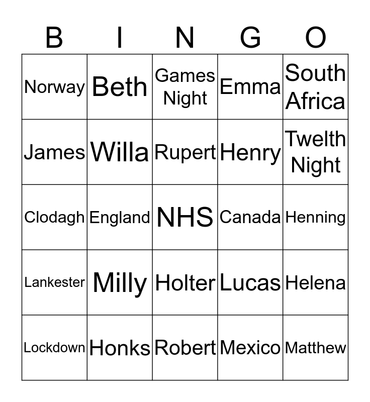 This bingo card has a free space and 49 words: John-Henry, Matthew, Ethan, Robert, Milly, Max, Beth, Robbie, James, Chris, Willa, Emma, Helena, Lucas, Sophie, Charlotte, Rupert, Canada, USA, South Africa, England, Mexico, Norway, Henry, Covid-19, Twelth Night, Lockdown, Curtis, Holter, Lankester, Sloan, Ferrabee, Cabot, Alison, Honks, Christopher, Frances, Martine, Henning, Jo, Brett, Yenil, David, Charlie, Clodagh, Games Night, Summer, Hope and Love.