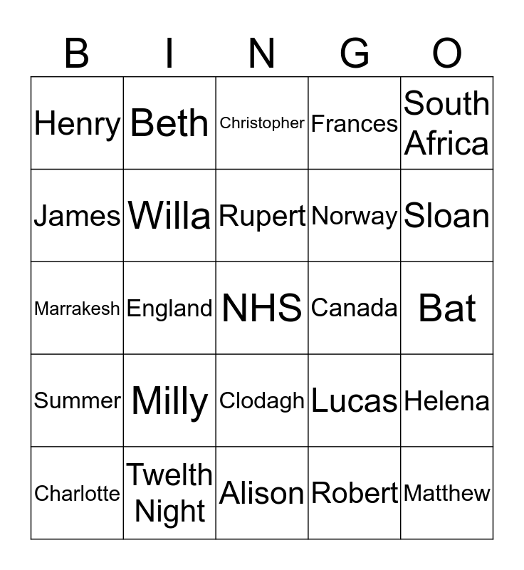 This bingo card has a free space and 53 words: John-Henry, Matthew, Ethan, Robert, Milly, Max, Beth, Robbie, James, Chris, Willa, Emma, Helena, Lucas, Sophie, Charlotte, Rupert, Canada, USA, South Africa, England, Mexico, Norway, Henry, Covid-19, Twelth Night, Lockdown, Curtis, Holter, Sloan, Lankester, Cabot, Ferrabbe, Yenil, David, Honks, Frances, Alison, Christopher, Charlie, Boris, Wuhan, Bat, Face Mask, Nightingal, Clodagh, Jo, Brett, Marrakesh, Summer, 2020, Virus and Zoom.