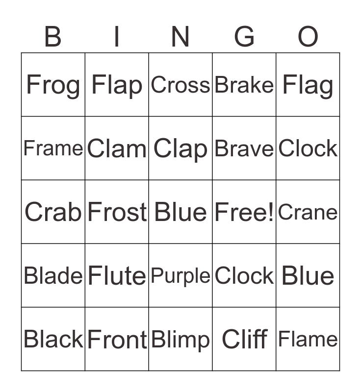 This bingo card has a free space and 24 words: Black, Flute, Clap, Cliff, Flag, Frog, Flap, Cross, Free!, Crane, Crab, Clam, Clock, Blue, Frame, Front, Blimp, Brake, Clock, Blade, Frost, Purple, Brave and Flame.