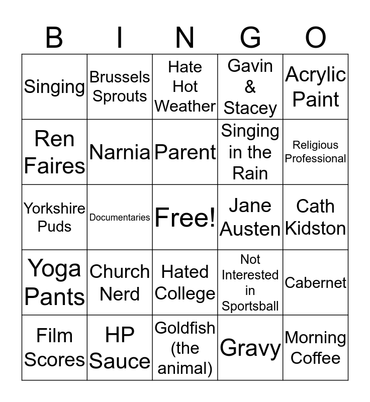 This bingo card has a free space and 24 words: Church Nerd, HP Sauce, Parent, Film Scores, Acrylic Paint, Singing, Ren Faires, Brussels Sprouts, Jane Austen, Hated College, Singing in the Rain, Yorkshire Puds, Not Interested in Sportsball, Cabernet, Narnia, Gravy, Cath Kidston, Hate Hot Weather, Religious Professional, Documentaries, Morning Coffee, Yoga Pants, Gavin & Stacey and Goldfish (the animal).