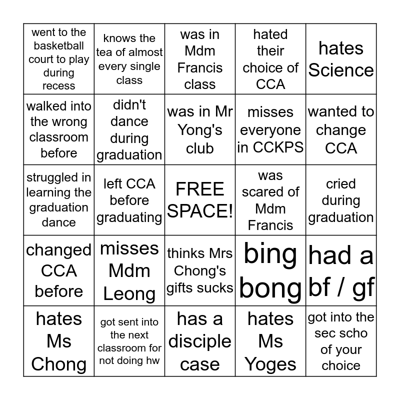 This bingo card has a free space and 24 words: hates Ms Chong, misses Mdm Leong, was in Mr Yong's club, hates Ms Yoges, hates Science, went to the basketball court to play during recess, knows the tea of almost every single class, was in Mdm Francis class, was scared of Mdm Francis, cried during graduation, struggled in learning the graduation dance, didn't dance during graduation, bing bong, had a bf / gf, walked into the wrong classroom before, got sent into the next classroom for not doing hw, has a disciple case, hated their choice of CCA, wanted to change CCA, changed CCA before, left CCA before graduating, thinks Mrs Chong's gifts sucks, misses everyone in CCKPS and got into the sec scho of your choice.