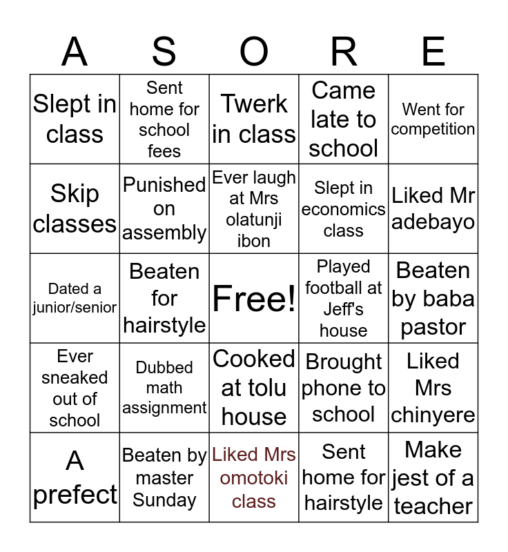 This bingo card has a free space and 24 words: Dubbed math assignment, Beaten by master Sunday, Ever laugh at Mrs olatunji ibon, A prefect, Went for competition, Slept in class, Skip classes, Sent home for school fees, Played football at Jeff's house, Cooked at tolu house, Slept in economics class, Dated a junior/senior, Brought phone to school, Liked Mrs chinyere, Punished on assembly, Sent home for hairstyle, Beaten by baba pastor, Twerk in class, Liked Mr adebayo, Beaten for hairstyle, Make jest of a teacher, Ever sneaked out of school, Came late to school and Liked Mrs omotoki class.