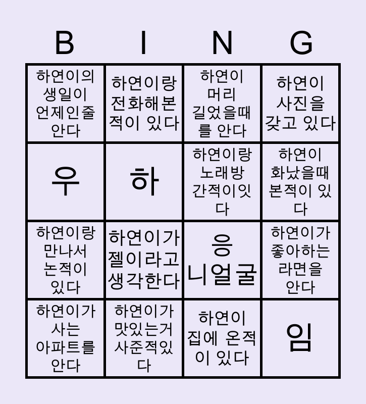 This bingo card has 20 words: 하연이가 사는 아파트를 안다, 하연이 폰 기종을 안다, 하연이 머리 길었을때를 안다, 하연이가 좋아하는 라면을 안다, 하연이를 알고지낸지 3년이 넘었다, 하연이가 젤이라고 생각한다, 하연이 집에 온적이 있다, 하연이 사진을 갖고 있다, 하연이랑 만나서 논적이 있다, 하연이랑 전화해본적이 있다, 응 니얼굴, 하연이 화났을때 본적이 있다, 하연이의 생일이 언제인줄 안다, 하연이가 맛있는거 사준적있다, 하연이랑 노래방 간적이잇다, 빙고는 재밌다, 우, 하, 연 and 임.