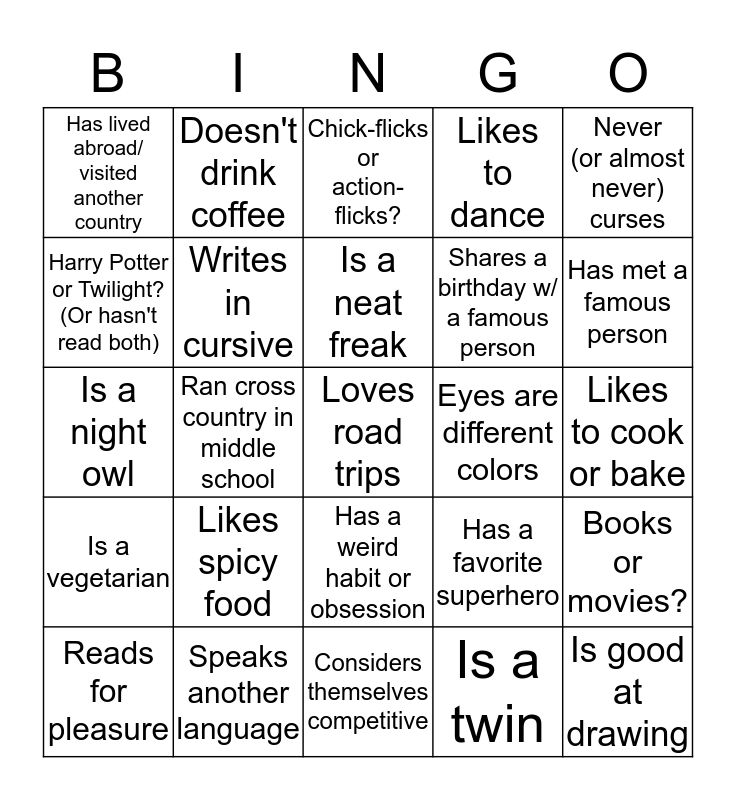 This bingo card has a free space and 24 words: Likes spicy food, Speaks another language, Is a neat freak, Reads for pleasure, Never (or almost never) curses, Has lived abroad/ visited another country, Harry Potter or Twilight? (Or hasn't read both), Doesn't drink coffee, Eyes are different colors, Has a weird habit or obsession, Shares a birthday w/ a famous person, Is a night owl, Has a favorite superhero, Books or movies?, Writes in cursive, Is a twin, Likes to cook or bake, Chick-flicks or action-flicks?, Has met a famous person, Ran cross country in middle school, Is good at drawing, Is a vegetarian, Likes to dance and Considers themselves competitive.