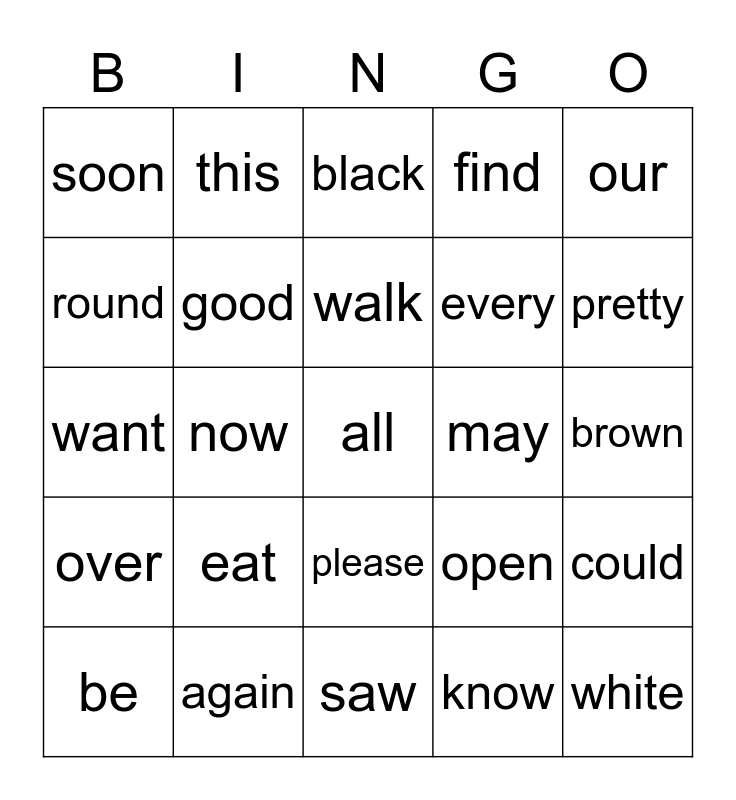 This bingo card has 25 words: eat, saw, walk, be, our, soon, round, this, may, please, every, want, open, could, good, white, brown, black, pretty, now, all, again, over, find and know.