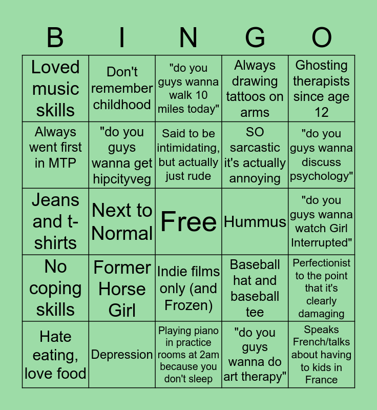 This bingo card has a free space and 24 words: Former Horse Girl, Depression, Said to be intimidating, but actually just rude, Hate eating, love food, Ghosting therapists since age 12, Loved music skills, Always went first in MTP, Don't remember childhood, Hummus, Indie films only (and Frozen), SO sarcastic it's actually annoying, Jeans and t-shirts, Baseball hat and baseball tee, Perfectionist to the point that it's clearly damaging, "do you guys wanna get hipcityveg, "do you guys wanna do art therapy", "do you guys wanna watch Girl Interrupted", "do you guys wanna walk 10 miles today", "do you guys wanna discuss psychology", Next to Normal, Speaks French/talks about having to kids in France, No coping skills, Always drawing tattoos on arms and Playing piano in practice rooms at 2am because you don't sleep.