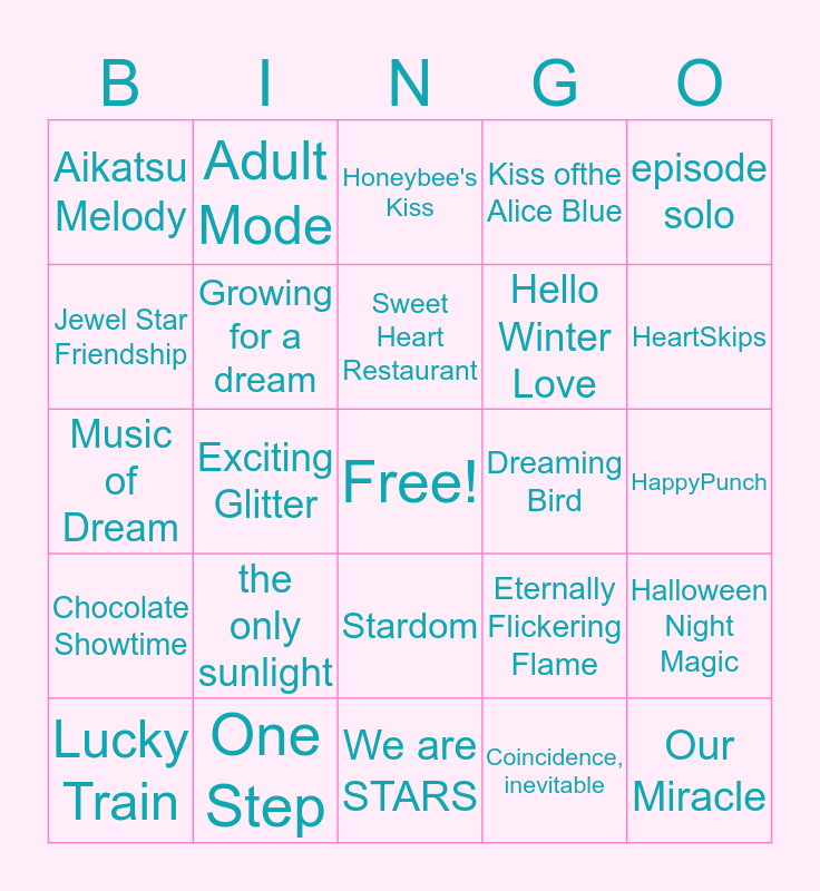 This bingo card has a free space and 24 words: the only sunlight, One Step, Sweet Heart Restaurant, Lucky Train, episode solo, Aikatsu Melody, Jewel Star Friendship, Adult Mode, Dreaming Bird, Stardom, Hello Winter Love, Music of Dream, Eternally Flickering Flame, Halloween Night Magic, Growing for a dream, Coincidence, inevitable, HappyPunch, Honeybee's Kiss, HeartSkips, Exciting Glitter, Our Miracle, Chocolate Showtime, Kiss ofthe Alice Blue and We are STARS.