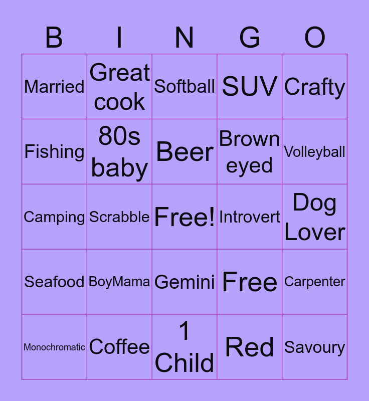 This bingo card has a free space and 25 words: BoyMama, 1 Child, Beer, Monochromatic, Crafty, Married, Fishing, Great cook, Introvert, Gemini, Brown eyed, Camping, Free, Carpenter, 80s baby, 90sHiphop/RnB, Dog Lover, Softball, Volleyball, Scrabble, Savoury, Coffee, Seafood, SUV and Red.
