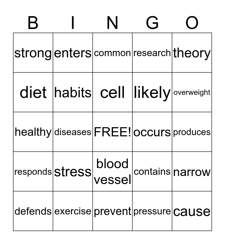 This bingo card has a free space and 24 words: stress, exercise, cell, defends, theory, strong, diet, enters, occurs, blood vessel, likely, healthy, contains, narrow, habits, pressure, produces, common, overweight, diseases, cause, responds, research and prevent.