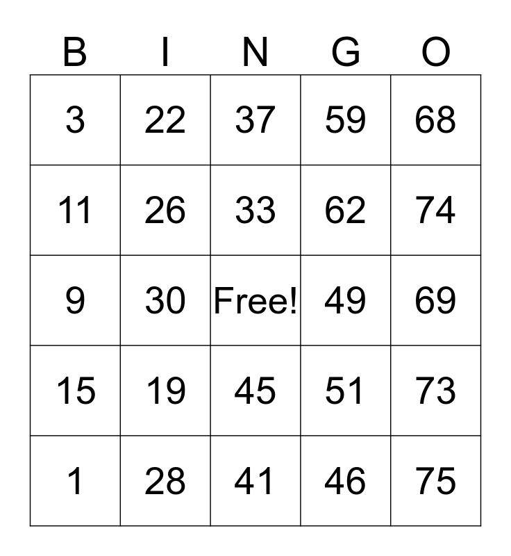 This bingo card has a free space and 24 words: 1, 19, 33, 46, 68, 3, 22, 37, 49, 69, 9, 26, 51, 73, 11, 28, 41, 59, 74, 15, 30, 45, 62 and 75.