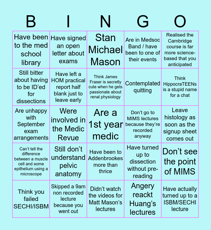 This bingo card has a free space and 24 words: Still don’t understand pelvic anatomy, Skipped a 9am non recorded lecture because you went out, Think James Fraser is secretly cute when he gets passionate about renal physiology, Think you failed SECHI/ISBM, Realised the Cambridge course is far more science-based that you anticipated, Have been to the med school library, Still bitter about having to be ID’ed for dissections, Have signed an open letter about exams, Don’t go to MIMS lectures because they’re recorded anyway, Have been to Addenbrookes more than thrice, Contemplated quitting, Are unhappy with September exam arrangements, Have turned up to dissection without pre-reading, Don’t see the point of MIMS, Have left a HOM practical report half blank just to leave early, Angery reackt Huang’s lectures, Leave histology as soon as the signup sheet comes out, Stan Michael Mason, Think HippocraTEENs is a stupid name for a chat, Were involved in the Medic Revue, Have actually turned up to a ISBM/SECHI lecture, Can’t tell the difference between a muscle cell and some epithelium using a microscope, Are in Medsoc Band / have been to one of their events and Didn’t watch the videos for Matt Mason’s lectures.