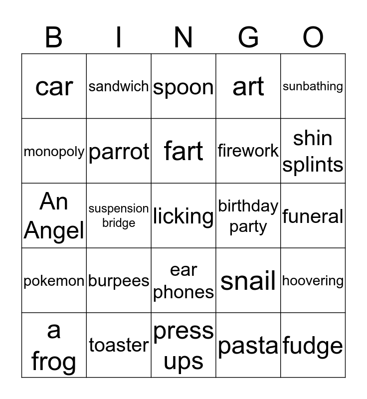 This bingo card has 30 words: toaster, dog, suspension bridge, tunnel, car, spoon, parrot, ear phones, birthday party, press ups, funeral, licking, pasta, fudge, shin splints, anger, snail, pokemon, burpees, sunbathing, An Angel, dragon, sandwich, firework, monopoly, art, hoovering, a frog, fart and gathering.