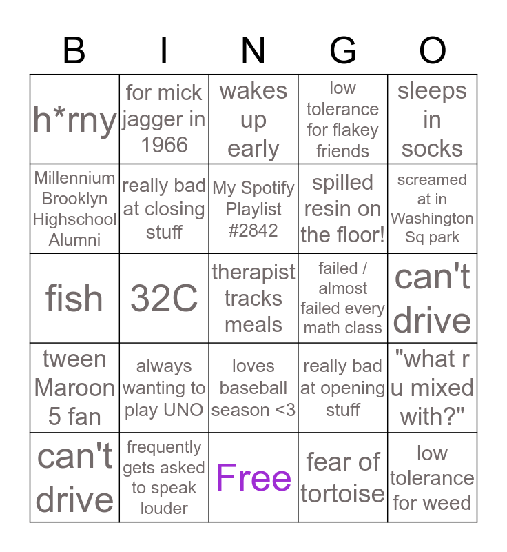 This bingo card has 25 words: tween Maroon 5 fan, frequently gets asked to speak louder, therapist tracks meals, fear of tortoise, sleeps in socks, h*rny, for mick jagger in 1966, wakes up early, failed / almost failed every math class, "what r u mixed with?", Millennium Brooklyn Highschool Alumni, really bad at closing stuff, Free, really bad at opening stuff, screamed at in Washington Sq park, can't drive, 32C, My Spotify Playlist #2842, spilled resin on the floor!, can't drive, fish, always wanting to play UNO, loves baseball season <3, low tolerance for flakey friends and low tolerance for weed.
