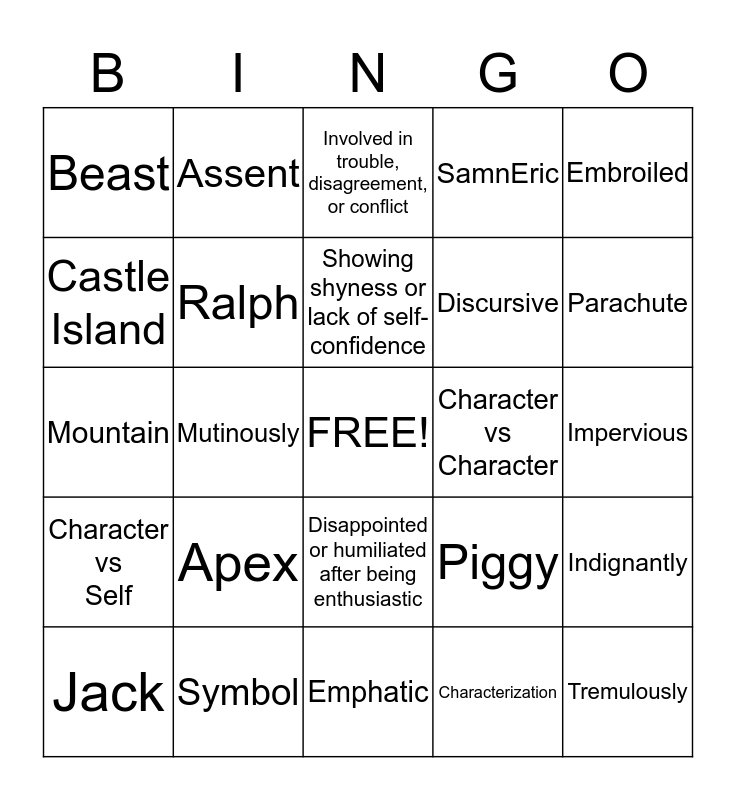 This bingo card has a free space and 24 words: Apex, Symbol, Showing shyness or lack of self-confidence, Jack, Embroiled, Beast, Castle Island, Assent, Character vs Character, Disappointed or humiliated after being enthusiastic, Discursive, Mountain, Piggy, Indignantly, Ralph, Characterization, Impervious, Involved in trouble, disagreement, or conflict, Parachute, Mutinously, Tremulously, Character vs Self, SamnEric and Emphatic.