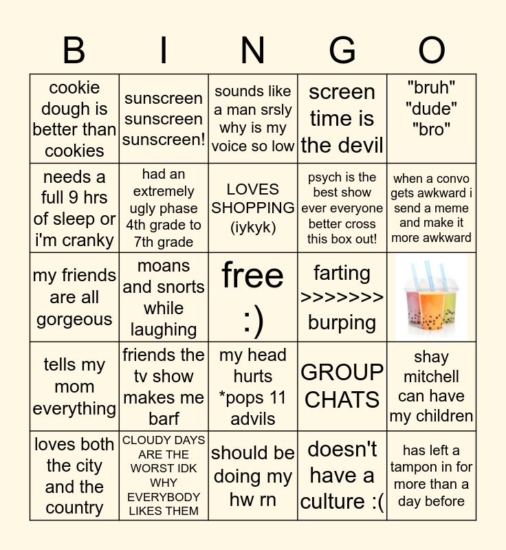 This bingo card has 1 images, a free space and 23 words: friends the tv show makes me barf, CLOUDY DAYS ARE THE WORST IDK WHY EVERYBODY LIKES THEM, LOVES SHOPPING (iykyk), loves both the city and the country, "bruh" "dude" "bro", cookie dough is better than cookies, needs a full 9 hrs of sleep or i'm cranky, sunscreen sunscreen sunscreen!, farting >>>>>>> burping, my head hurts *pops 11 advils, psych is the best show ever everyone better cross this box out!, my friends are all gorgeous, GROUP CHATS, shay mitchell can have my children, had an extremely ugly phase 4th grade to 7th grade, doesn't have a culture :(, sounds like a man srsly why is my voice so low, when a convo gets awkward i send a meme and make it more awkward, moans and snorts while laughing, has left a tampon in for more than a day before, tells my mom everything, screen time is the devil and should be doing my hw rn.