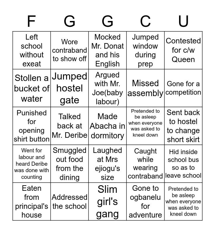 This bingo card has 26 words: Laughed at Mrs ejiogu's size, Gone to ogbanelu for adventure, Argued with Mr. Joe(baby labour), Addressed the school, Contested for c/w Queen, Left school without exeat, Stollen a bucket of water, Wore contraband to show off, Sent back to hostel to change short skirt, Caught while wearing contraband, Missed assembly, Punished for opening shirt button, Hid inside school bus so as to leave school, Eaten from principal's house, Talked back at Mr. Deribe, Danced on stage, Jumped window during prep, Went for labour and heard Deribe was done with counting, Mocked Mr. Donat and his English, Made Abacha in dormitory, Gone for a competition, Slim girl's gang, Pretended to be asleep when everyone was asked to kneel down, Smuggled out food from the dining, Jumped hostel gate and Pretended to be asleep when everyone was asked to kneel down.