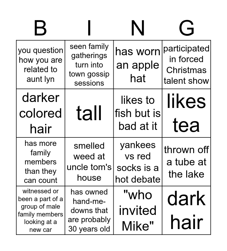 This bingo card has 17 words: "who invited Mike", witnessed or been a part of a group of male family members looking at a new car, has worn an apple hat, you question how you are related to aunt lyn, smelled weed at uncle tom's house, participated in forced Christmas talent show, thrown off a tube at the lake, likes to fish but is bad at it, likes tea, tall, has owned hand-me-downs that are probably 30 years old, yankees vs red socks is a hot debate, darker colored hair, seen family gatherings turn into town gossip sessions, has more family members than they can count, is annoyed by someone simply because they are from NY and dark hair.
