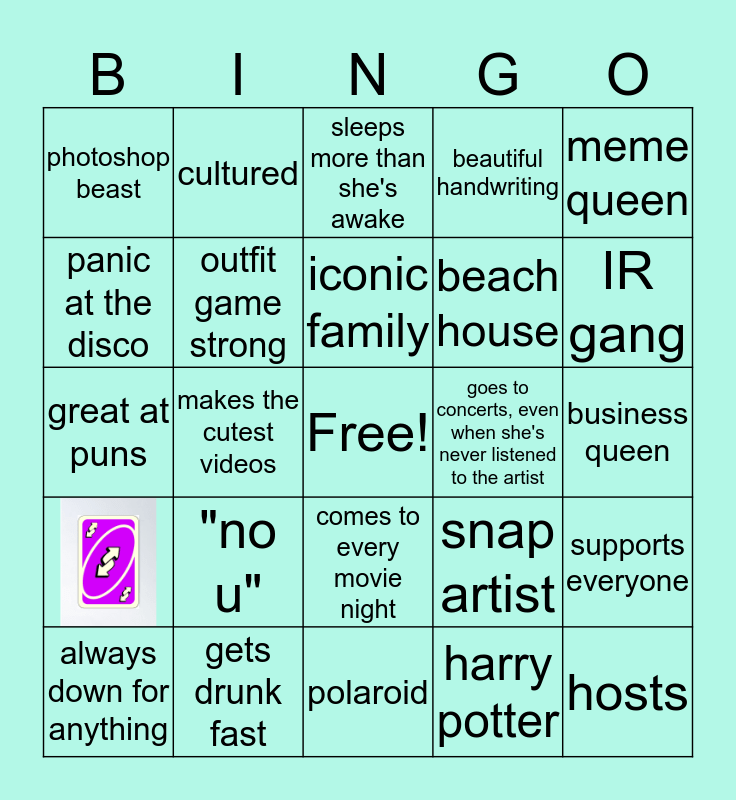 This bingo card has 1 images, a free space and 23 words: "no u", gets drunk fast, iconic family, always down for anything, meme queen, photoshop beast, panic at the disco, cultured, goes to concerts, even when she's never listened to the artist, comes to every movie night, beach house, great at puns, snap artist, supports everyone, outfit game strong, harry potter, business queen, sleeps more than she's awake, IR gang, makes the cutest videos, hosts, beautiful handwriting and polaroid.