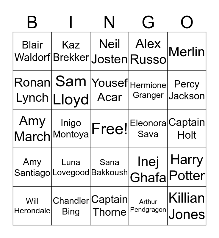 This bingo card has a free space and 24 words: Luna Lovegood, Chandler Bing, Yousef Acar, Will Herondale, Merlin, Blair Waldorf, Ronan Lynch, Kaz Brekker, Eleonora Sava, Sana Bakkoush, Hermione Granger, Amy March, Inej Ghafa, Harry Potter, Sam Lloyd, Arthur Pendgragon, Captain Holt, Neil Josten, Percy Jackson, Inigo Montoya, Killian Jones, Amy Santiago, Alex Russo and Captain Thorne.