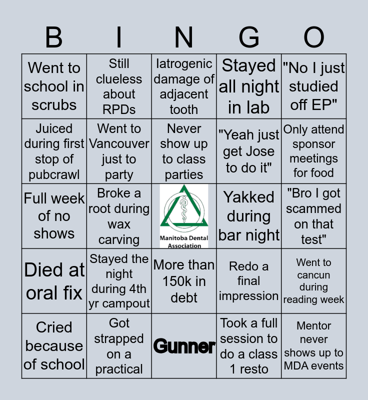 This bingo card has a free space and 24 words: Stayed the night during 4th yr campout, Got strapped on a practical, Never show up to class parties, Cried because of school, "No I just studied off EP", Went to school in scrubs, Juiced during first stop of pubcrawl, Still clueless about RPDs, Yakked during bar night, More than 150k in debt, "Yeah just get Jose to do it", Full week of no shows, Redo a final impression, Went to cancun during reading week, Went to Vancouver just to party, Took a full session to do a class 1 resto, "Bro I got scammed on that test", Iatrogenic damage of adjacent tooth, Only attend sponsor meetings for food, Broke a root during wax carving, Mentor never shows up to MDA events, Died at oral fix, Stayed all night in lab and Gunner.