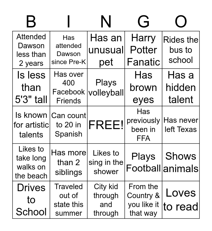 This bingo card has a free space and 24 words: Has more than 2 siblings, Traveled out of state this summer, Plays volleyball, Drives to School, Rides the bus to school, Attended Dawson less than 2 years, Is less than 5'3" tall, Has attended Dawson since Pre-K, Has previously been in FFA, Likes to sing in the shower, Has brown eyes, Is known for artistic talents, Plays Football, Shows animals, Has over 400 Facebook Friends, From the Country & you like it that way, Has never left Texas, Has an unusual pet, Has a hidden talent, Can count to 20 in Spanish, Loves to read, Likes to take long walks on the beach, Harry Potter Fanatic and City kid through and through.