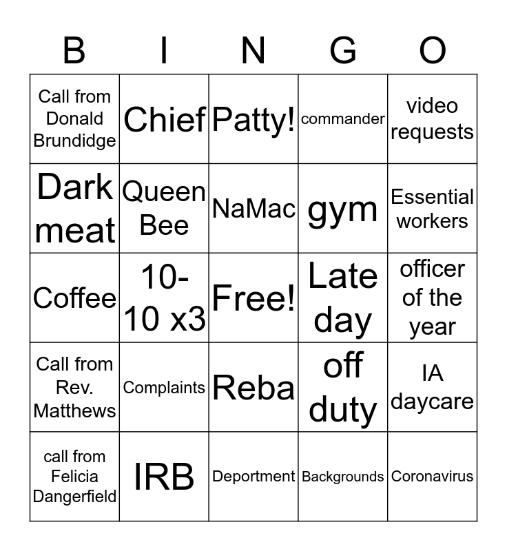 This bingo card has a free space and 29 words: call from Felicia Dangerfield, Videographer, 10-10 x3, Kohls, Call from Donald Brundidge, Patty!, Queen Bee, Complaints, Late day, IRB, officer of the year, Coronavirus, Deportment, Backgrounds, Essential workers, Polygraphs, Reba, Call from Rev. Matthews, video requests, Coffee, off duty, Tiger King, gym, Dark meat, commander, Chief, IA daycare, NaMac and confidential.