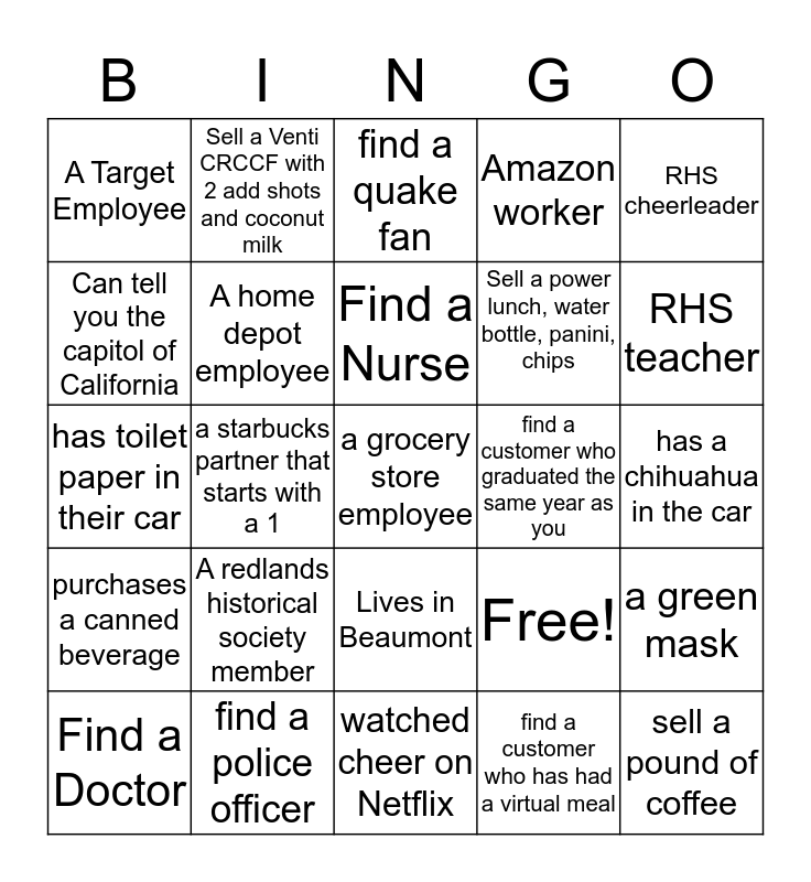 This bingo card has 25 words: A redlands historical society member, watched cheer on Netflix, Find a Nurse, Find a Doctor, RHS cheerleader, A Target Employee, Can tell you the capitol of California, Sell a Venti CRCCF with 2 add shots and coconut milk, find a customer who graduated the same year as you, Lives in Beaumont, Sell a power lunch, water bottle, panini, chips, has toilet paper in their car, Free!, a green mask, A home depot employee, sell a pound of coffee, has a chihuahua in the car, find a quake fan, RHS teacher, a starbucks partner that starts with a 1, a grocery store employee, find a police officer, purchases a canned beverage, Amazon worker and find a customer who has had a virtual meal.