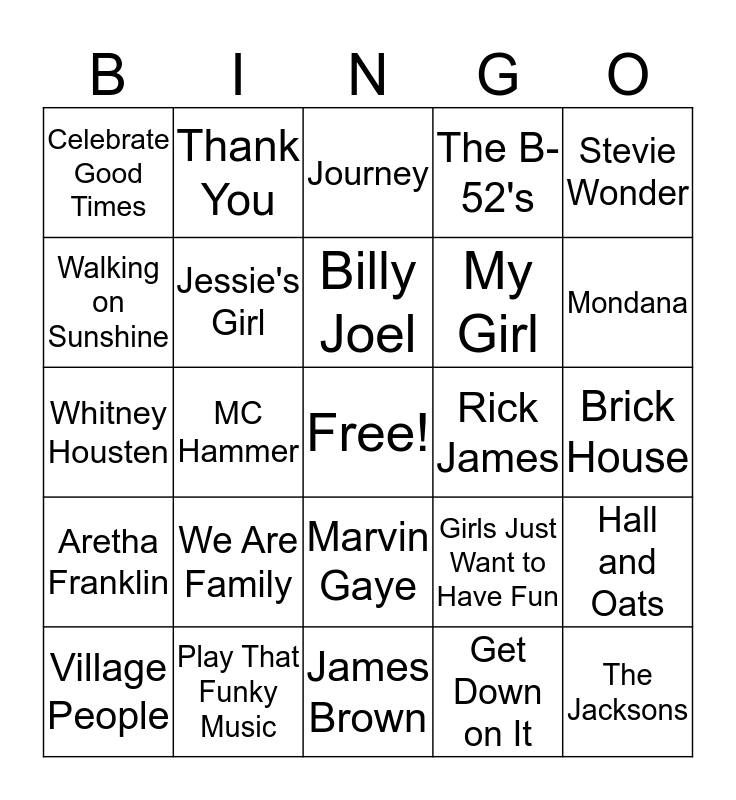This bingo card has a free space and 29 words: Village People, Stayin' Alive, MC Hammer, I Will Survive, Celebrate Good Times, Journey, Jessie's Girl, We Are Family, Rick James, Play That Funky Music, Brick House, The Jacksons, James Brown, Get Down on It, Mondana, September, Marvin Gaye, Aretha Franklin, Stevie Wonder, Whitney Housten, Girls Just Want to Have Fun, Michael Jackson, My Girl, Walking on Sunshine, The B-52's, Thank You, Hall and Oats, Billy Joel and Van Morrison.