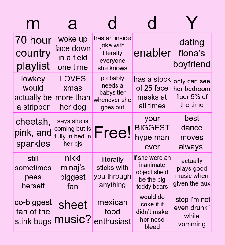This bingo card has a free space and 24 words: nikki minaj’s biggest fan, sheet music?, probably needs a babysitter whenever she goes out, co-biggest fan of the stink bugs, dating fiona’s boyfriend, 70 hour country playlist, lowkey would actually be a stripper, woke up face down in a field one time, your BIGGEST hype man ever, literally sticks with you through anything, has a stock of 25 face masks at all times, cheetah, pink, and sparkles, if she were an inanimate object she’d be the big teddy bears, actually plays good music when given the aux, LOVES xmas more than her dog, would do coke if it didn’t make her nose bleed, best dance moves always., has an inside joke with literally everyone she knows, only can see her bedroom floor 5% of the time, says she is coming but is fully in bed in her pjs, “stop i’m not even drunk” while vomming, still sometimes pees herself, enabler and mexican food enthusiast.