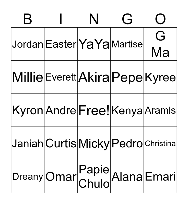 This bingo card has a free space and 29 words: Dreany, Ronda, Andre, Joey, Jordan, YaYa, Everett, Curtis, Kenya, Omar, Aramis, Emari, Papie Chulo, Alana, Kyree, Jessie, Micky, Janiah, G Ma, Kyron, Pedro, Lhea, Pepe, Millie, Martise, Easter, Christina, Akira and Mateo.