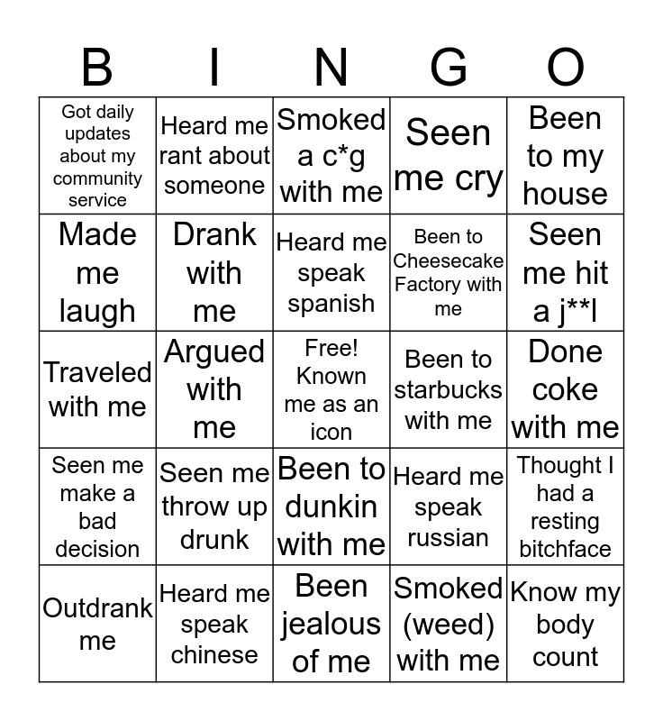 This bingo card has a free space and 24 words: Seen me throw up drunk, Heard me speak chinese, Heard me speak spanish, Outdrank me, Been to my house, Got daily updates about my community service, Made me laugh, Heard me rant about someone, Been to starbucks with me, Been to dunkin with me, Been to Cheesecake Factory with me, Traveled with me, Heard me speak russian, Thought I had a resting bitchface, Drank with me, Smoked (weed) with me, Done coke with me, Smoked a c*g with me, Seen me hit a j**l, Argued with me, Know my body count, Seen me make a bad decision, Seen me cry and Been jealous of me.