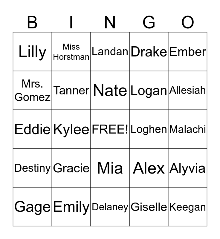 This bingo card has a free space and 24 words: Gracie, Emily, Nate, Gage, Ember, Lilly, Mrs. Gomez, Miss Horstman, Loghen, Mia, Logan, Eddie, Alex, Alyvia, Tanner, Giselle, Malachi, Landan, Allesiah, Kylee, Keegan, Destiny, Drake and Delaney.