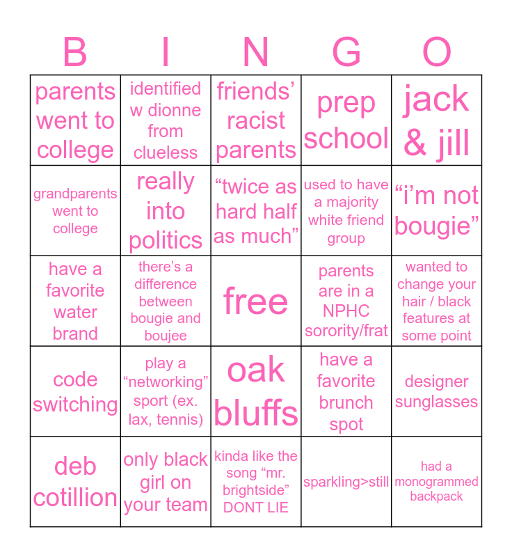 This bingo card has a free space and 24 words: play a “networking” sport (ex. lax, tennis), only black girl on your team, “twice as hard half as much”, deb cotillion, jack & jill, parents went to college, grandparents went to college, identified w dionne from clueless, parents are in a NPHC sorority/frat, oak bluffs, used to have a majority white friend group, have a favorite water brand, have a favorite brunch spot, designer sunglasses, really into politics, sparkling>still, wanted to change your hair / black features at some point, friends’ racist parents, “i’m not bougie”, there’s a difference between bougie and boujee, had a monogrammed backpack, code switching, prep school and kinda like the song “mr. brightside” DONT LIE.