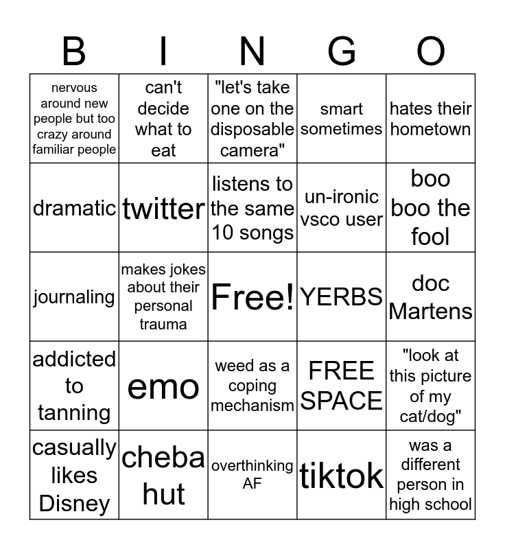 This bingo card has a free space and 25 words: emo, overthinking AF, listens to the same 10 songs, casually likes Disney, hates their hometown, nervous around new people but too crazy around familiar people, dramatic, can't decide what to eat, YERBS, weed as a coping mechanism, un-ironic vsco user, journaling, FREE SPACE, "look at this picture of my cat/dog", twitter, shops constantly but still wears the same things, doc Martens, "let's take one on the disposable camera", boo boo the fool, makes jokes about their personal trauma, was a different person in high school, cheba hut, addicted to tanning, smart sometimes and tiktok.