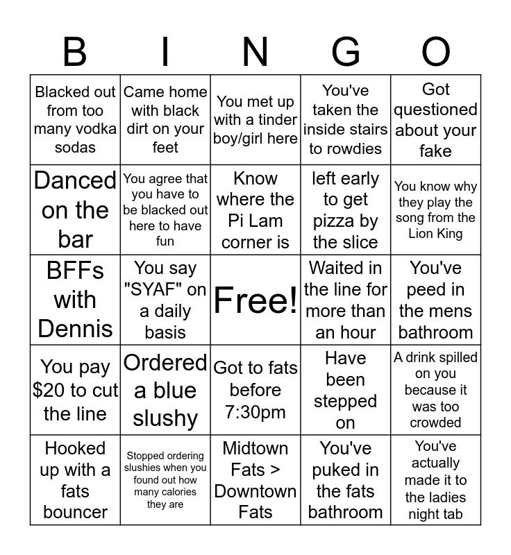 This bingo card has a free space and 24 words: Ordered a blue slushy, Stopped ordering slushies when you found out how many calories they are, Know where the Pi Lam corner is, Hooked up with a fats bouncer, Got questioned about your fake, Blacked out from too many vodka sodas, Danced on the bar, Came home with black dirt on your feet, Waited in the line for more than an hour, Got to fats before 7:30pm, left early to get pizza by the slice, BFFs with Dennis, Have been stepped on, A drink spilled on you because it was too crowded, You agree that you have to be blacked out here to have fun, You've puked in the fats bathroom, You've peed in the mens bathroom, You met up with a tinder boy/girl here, You know why they play the song from the Lion King, You say "SYAF" on a daily basis, You've actually made it to the ladies night tab, You pay $20 to cut the line, You've taken the inside stairs to rowdies and Midtown Fats > Downtown Fats.