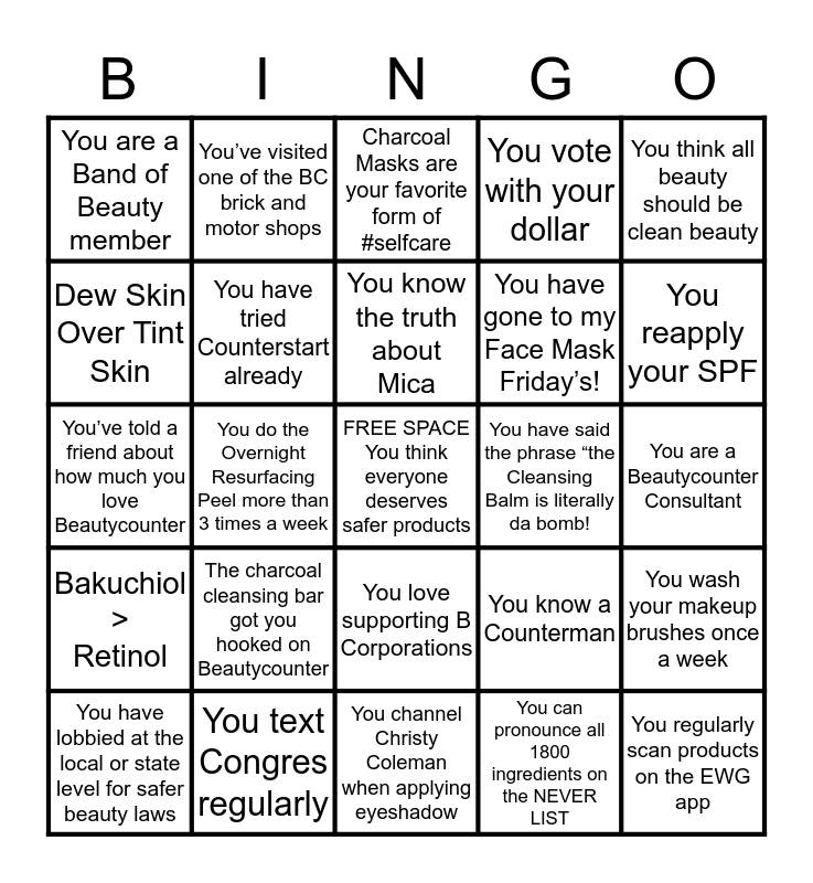 This bingo card has a free space and 24 words: The charcoal cleansing bar got you hooked on Beautycounter, You text Congres regularly, You know the truth about Mica, You have lobbied at the local or state level for safer beauty laws, You think all beauty should be clean beauty, You are a Band of Beauty member, Dew Skin Over Tint Skin, You’ve visited one of the BC brick and motor shops, You have said the phrase “the Cleansing Balm is literally da bomb!, You love supporting B Corporations, You have gone to my Face Mask Friday’s!, You’ve told a friend about how much you love Beautycounter, You know a Counterman, You wash your makeup brushes once a week, You have tried Counterstart already, You can pronounce all 1800 ingredients on the NEVER LIST, You are a Beautycounter Consultant, Charcoal Masks are your favorite form of #selfcare, You reapply your SPF, You do the Overnight Resurfacing Peel more than 3 times a week, You regularly scan products on the EWG app, Bakuchiol > Retinol, You vote with your dollar and You channel Christy Coleman when applying eyeshadow.