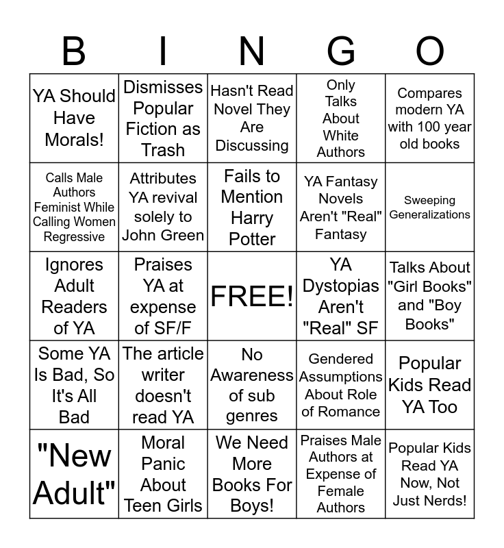 This bingo card has a free space and 24 words: The article writer doesn't read YA, Moral Panic About Teen Girls, Fails to Mention Harry Potter, "New Adult", Compares modern YA with 100 year old books, YA Should Have Morals!, Calls Male Authors Feminist While Calling Women Regressive, Dismisses Popular Fiction as Trash, YA Dystopias Aren't "Real" SF, No Awareness of sub genres, YA Fantasy Novels Aren't "Real" Fantasy, Ignores Adult Readers of YA, Gendered Assumptions About Role of Romance, Popular Kids Read YA Too, Attributes YA revival solely to John Green, Praises Male Authors at Expense of Female Authors, Talks About "Girl Books" and "Boy Books", Hasn't Read Novel They Are Discussing, Sweeping Generalizations, Praises YA at expense of SF/F, Popular Kids Read YA Now, Not Just Nerds!, Some YA Is Bad, So It's All Bad, Only Talks About White Authors and We Need More Books For Boys!.