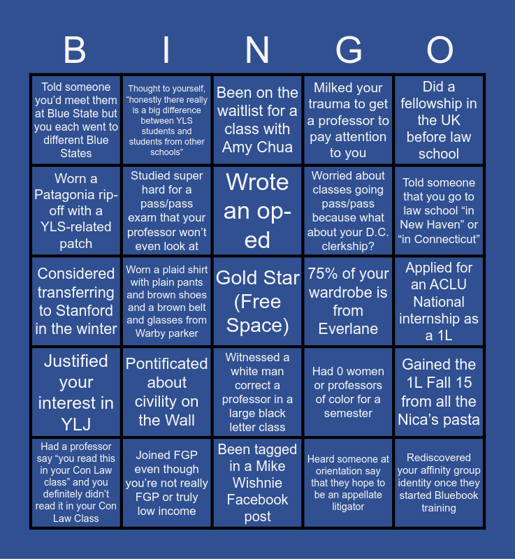 This bingo card has a free space and 24 words: Had a professor say “you read this in your Con Law class” and you definitely didn’t read it in your Con Law Class, Pontificated about civility on the Wall, Wrote an op-ed, Heard someone at orientation say that they hope to be an appellate litigator, Did a fellowship in the UK before law school, Told someone you’d meet them at Blue State but you each went to different Blue States, Thought to yourself, “honestly there really is a big difference between YLS students and students from other schools”, Been on the waitlist for a class with Amy Chua, 75% of your wardrobe is from Everlane, Applied for an ACLU National internship as a 1L, Considered transferring to Stanford in the winter, Studied super hard for a pass/pass exam that your professor won’t even look at, Had 0 women or professors of color for a semester, Gained the 1L Fall 15 from all the Nica’s pasta, Worn a Patagonia rip-off with a YLS-related patch, Joined FGP even though you’re not really FGP or truly low income, Been tagged in a Mike Wishnie Facebook post, Milked your trauma to get a professor to pay attention to you, Told someone that you go to law school “in New Haven” or “in Connecticut”, Justified your interest in YLJ, Worn a plaid shirt with plain pants and brown shoes and a brown belt and glasses from Warby parker, Witnessed a white man correct a professor in a large black letter class, Worried about classes going pass/pass because what about your D.C. clerkship? and Rediscovered your affinity group identity once they started Bluebook training.