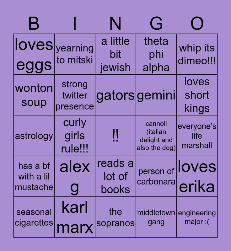 This bingo card has a free space and 24 words: alex g, karl marx, gators, seasonal cigarettes, whip its dimeo!!!, loves eggs, wonton soup, yearning to mitski, cannoli (italian delight and also the dog), reads a lot of books, gemini, astrology, person of carbonara, loves erika, strong twitter presence, middletown gang, everyone’s life marshall, a little bit jewish, loves short kings, curly girls rule!!!, engineering major :(, has a bf with a lil mustache, theta phi alpha and the sopranos.