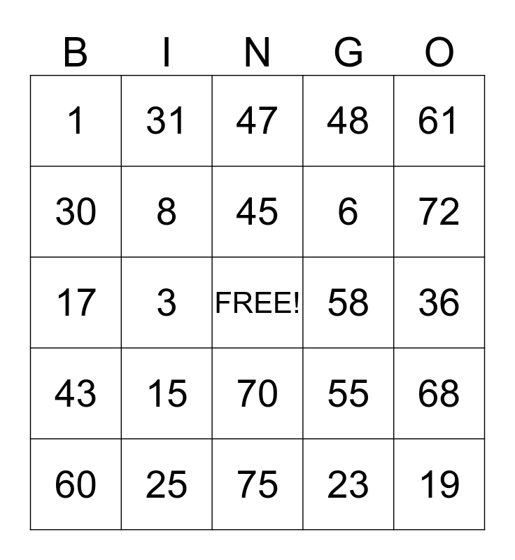 This bingo card has a free space and 24 words: 15, 25, 45, 60, 61, 1, 30, 31, 58, 70, 6, 17, 55, 68, 8, 23, 36, 47, 72, 3, 19, 43, 48 and 75.
