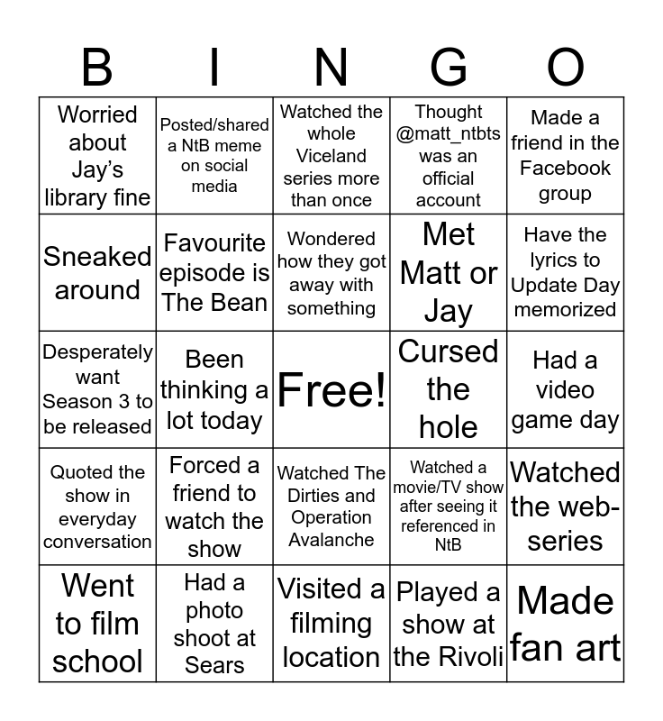 This bingo card has a free space and 24 words: Forced a friend to watch the show, Had a photo shoot at Sears, Wondered how they got away with something, Went to film school, Made a friend in the Facebook group, Worried about Jay’s library fine, Sneaked around, Posted/shared a NtB meme on social media, Cursed the hole, Watched The Dirties and Operation Avalanche, Met Matt or Jay, Desperately want Season 3 to be released, Watched a movie/TV show after seeing it referenced in NtB, Watched the web-series, Favourite episode is The Bean, Played a show at the Rivoli, Had a video game day, Watched the whole Viceland series more than once, Have the lyrics to Update Day memorized, Been thinking a lot today, Made fan art, Quoted the show in everyday conversation, Thought @matt_ntbts was an official account and Visited a filming location.