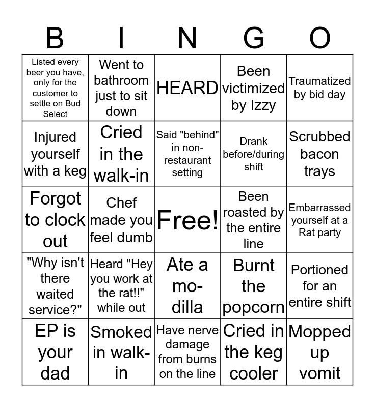 This bingo card has a free space and 24 words: Heard "Hey you work at the rat!!" while out, Smoked in walk-in, Said "behind" in non-restaurant setting, EP is your dad, Traumatized by bid day, Listed every beer you have, only for the customer to settle on Bud Select, Injured yourself with a keg, Went to bathroom just to sit down, Been roasted by the entire line, Ate a mo-dilla, Drank before/during shift, Forgot to clock out, Burnt the popcorn, Portioned for an entire shift, Cried in the walk-in, Cried in the keg cooler, Embarrassed yourself at a Rat party, HEARD, Scrubbed bacon trays, Chef made you feel dumb, Mopped up vomit, "Why isn't there waited service?", Been victimized by Izzy and Have nerve damage from burns on the line.