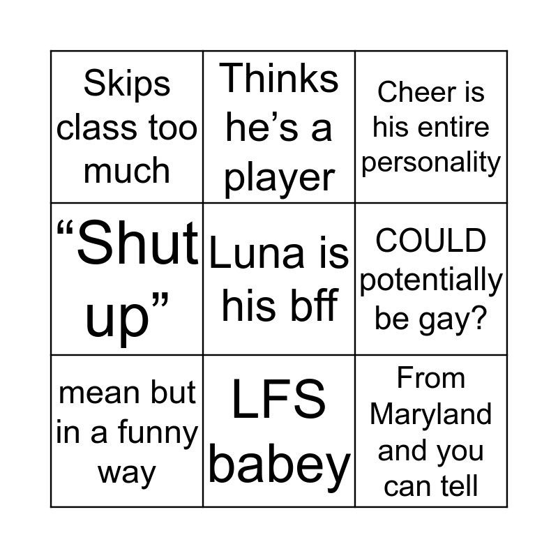 This bingo card has a free space and 8 words: COULD potentially be gay?, Cheer is his entire personality, Thinks he’s a player, mean but in a funny way, Skips class too much, From Maryland and you can tell, “Shut up” and LFS babey.